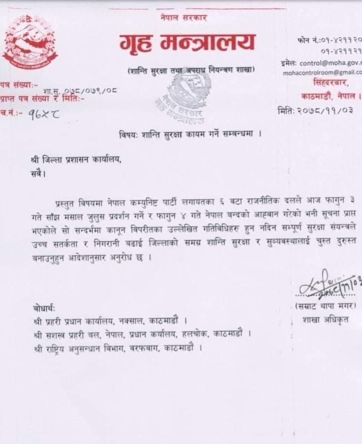 ‘नेपाल कम्युनिष्ट पार्टी लगायतका ६ वटा राजनीतिक दलले आज फागुन ३ गते साँझ मसाल जुलुस प्रदर्शन गर्ने र फागुन ४ गते नेपाल बन्दको आह्वान गरेको भनी सूचना प्राप्त भएकोले सो सन्दर्भमा कानून विपरीतका उल्लेखित गतिविधिहरु हुन नदिन सम्पूर्ण सुरक्षा संयन्त्रले उच्च सतर्कता र निगरानी बढाई जिल्लाको समग्र शान्ति सुरक्षा र सुव्यवस्थालाई चुस्त दुरुस्त बनाउनुहुन आदेशानुसार अनुरोध छ’ गृहमन्त्रालयले भनेको छ ।
