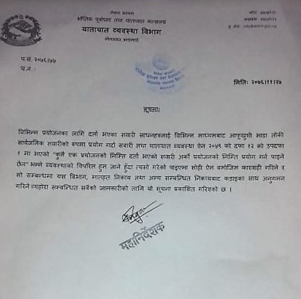 सूचनामा यातायात व्यवस्था ऐनको दफा १२ मा ‘कुनै एक प्रयोजनका निम्ति दर्ता भएको सवारी अर्को प्रयोजनमा लगाउन पाइने छैन’ भन्ने व्यवस्था रहेको स्मरण गराएको छ ।