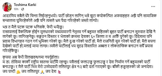 पार्टी छोड्ने हल्ला चलिरहेकाबीच कार्कीले भ्रमपूर्ण हल्लाको पछि नलाग्न आग्रह गर्दै आफू ललितपुर क्षेत्र नम्बर ३ बाटै चुनाव लड्ने बताएकी हुन् ।
