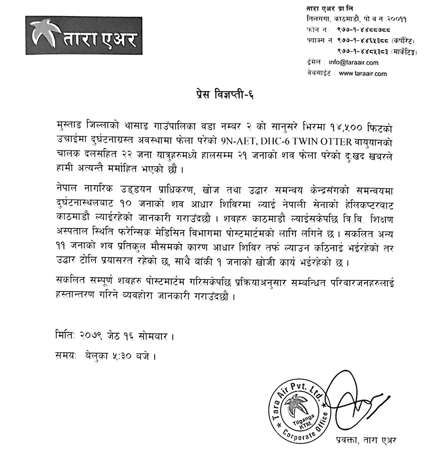 काठमाडौं ल्याएका शव पोस्टमार्टमका लागि त्रिवि शिक्षण अस्पताल लगिने र त्यसपछि आफन्तको जिम्मा लगाउने तयारी छ । शव ल्याइने भएसँगै मृतकका आफन्त त्रिभुवन विमानस्थल पुगेका थिए । बाँकी शव भने भोलि मात्र ल्याउने तयारी गरिएको छ । एउटा शव भने अझै फेला पर्न नसकेको तारा एयरले जनाएको छ ।