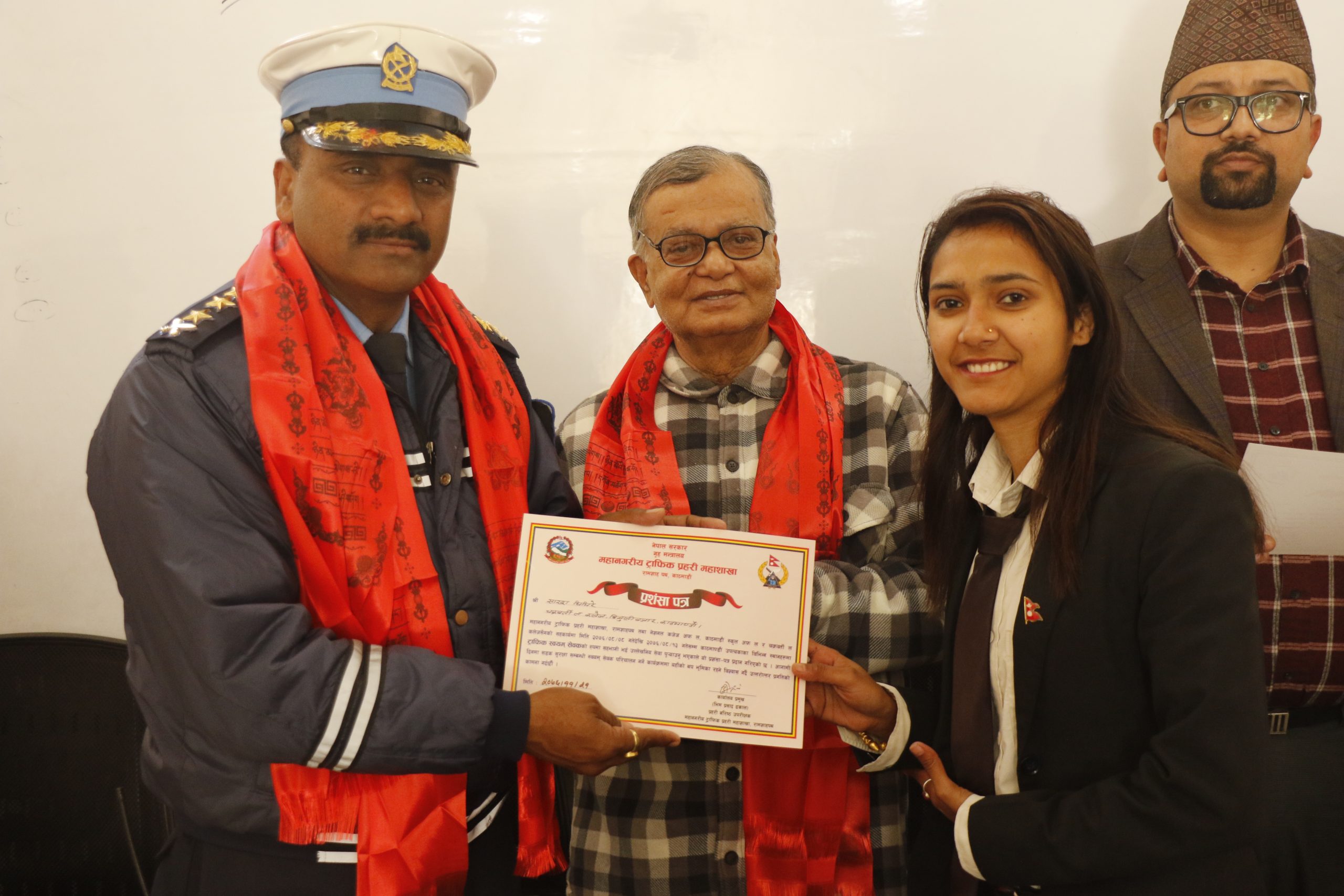 कार्यक्रममा महाशाखाका प्रमुख प्रहरी बरिष्ठ उपरीक्षक भिम प्रसाद ढकाल र काठमाडौँ स्कुल अफ लका डाईरेक्टर युवराज सङ्ग्रौलाले विद्यार्थीहरू ट्राफिक स्वयम् सेवकहरूलाई प्रमाण प्रत्र दिएर सम्मान गरेका हुन ।