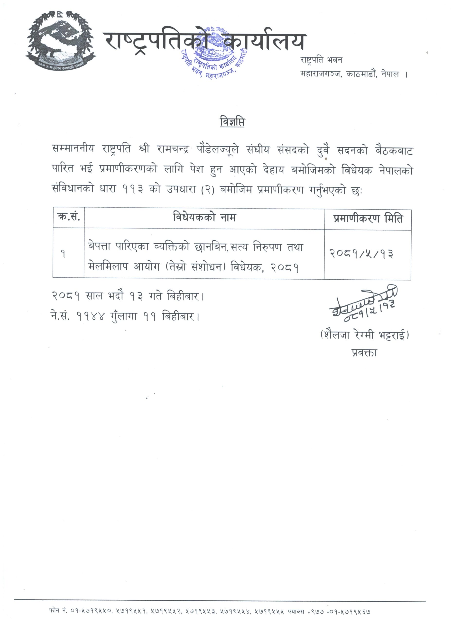 राष्ट्रपति पौडेलले बिहिबार नेपालको संविधानको धारा ११३ उपधारा २ बमोजिम प्रमाणीकरण गरेका राष्ट्रपति कार्यालयका प्रवक्ता शैलजा रेग्मी भट्टराईले विज्ञप्तिमार्फत जानकारी दिएकी छन् ।
