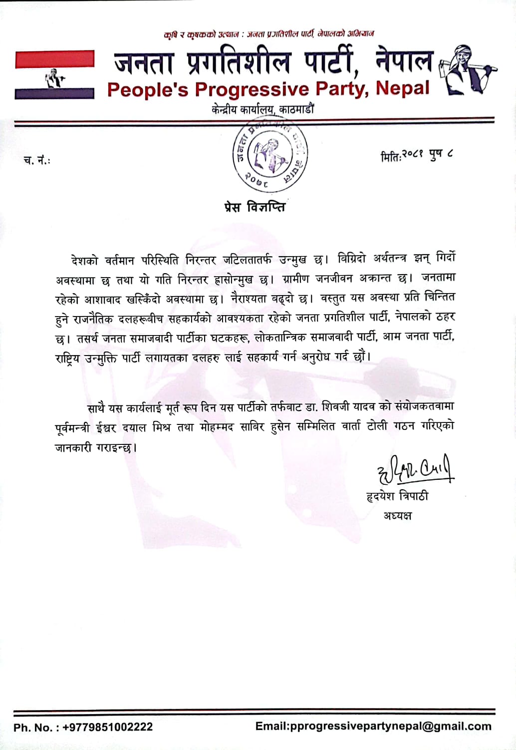 विज्ञप्तिमा उल्लेख छ, ‘जनतामा रहेको आशावाद खस्किँदो अवस्थामा छ । नैराश्य बढ्दो छ । वस्तुतः यस अवस्थाप्रति चिन्तित हुने राजनीतिक दलहरूबीच सहकार्यको आवश्यकता रहेको जनता प्रगतिशील पार्टी नेपालको ठहर छ ।’