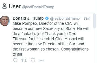 ट्रम्पले ट्विट गर्दै टेलर्सनलाई हटाएर पेम्पोलाई विदेशमन्त्री बनाएको सार्वजनिक गरेका हुन् ।