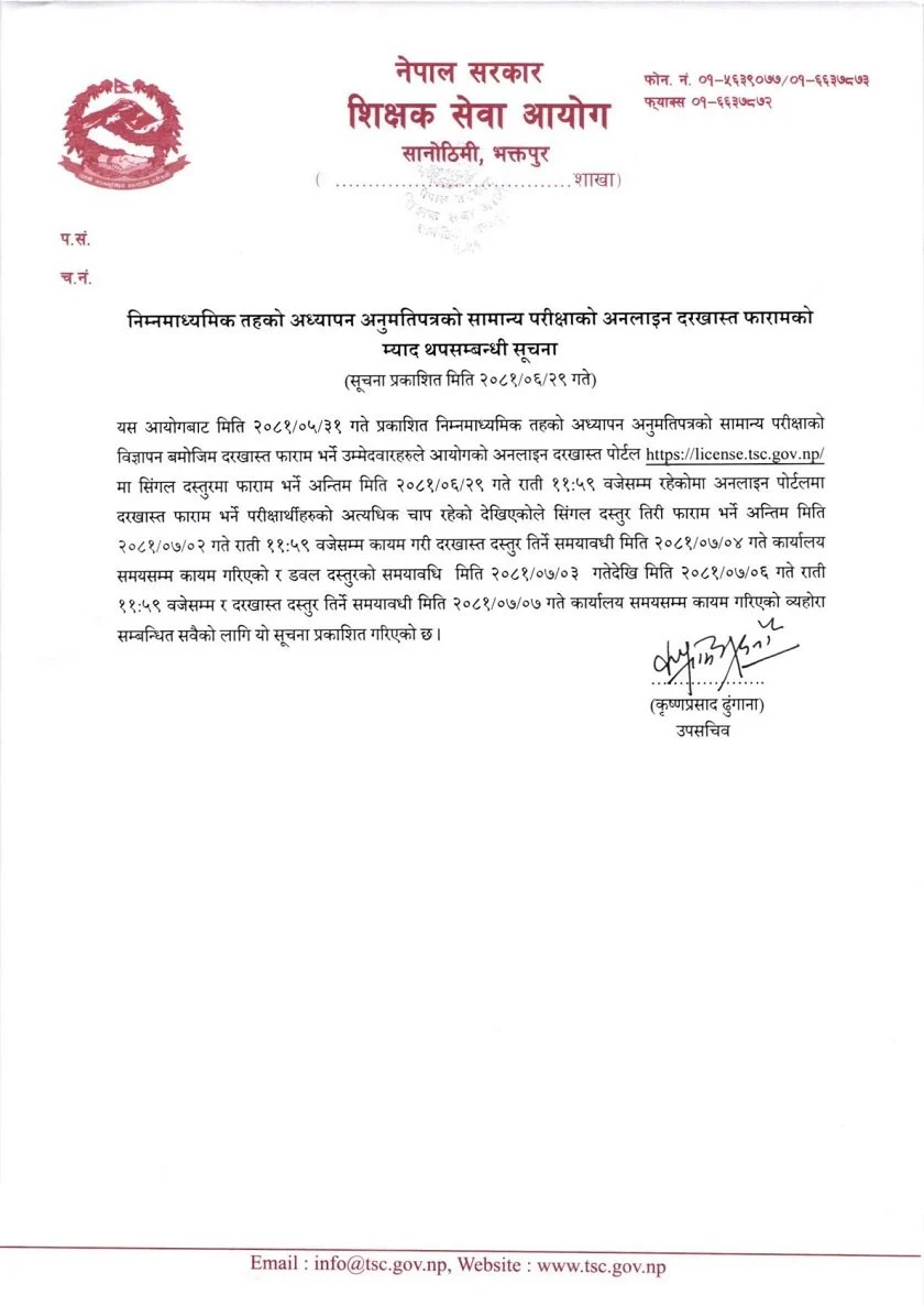 आयोगले भदौ ३१ गते सूचना जारी गरेर गर्दै आवेदन फाराम भर्न आह्वान गरेको थियो । अनलाइन पोर्टलमा दरखास्त फाराम भर्ने परीक्षार्थीहरूको अत्यधिक चाप रहेकाले म्याद थप गरिएको आयोगका उपसचिव कृष्णप्रसाद ढुङ्गानाले बताए ।