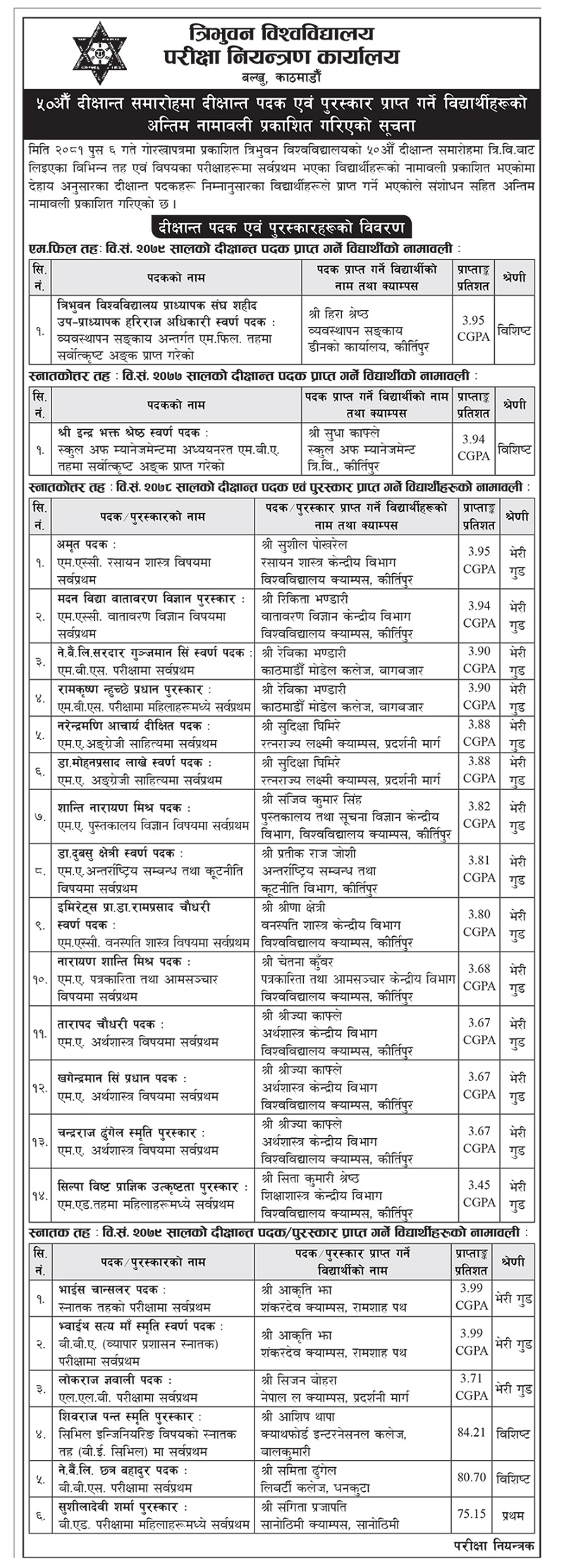 त्रिवि परीक्षा नियन्त्रण कार्यालय बल्खुले ५० औँ दीक्षान्त समारोहमा पदक पाउने विद्यार्थीको नाम सार्वजनिक गरेको हो । दीक्षान्त समारोह शनिवार हुँदैछ ।