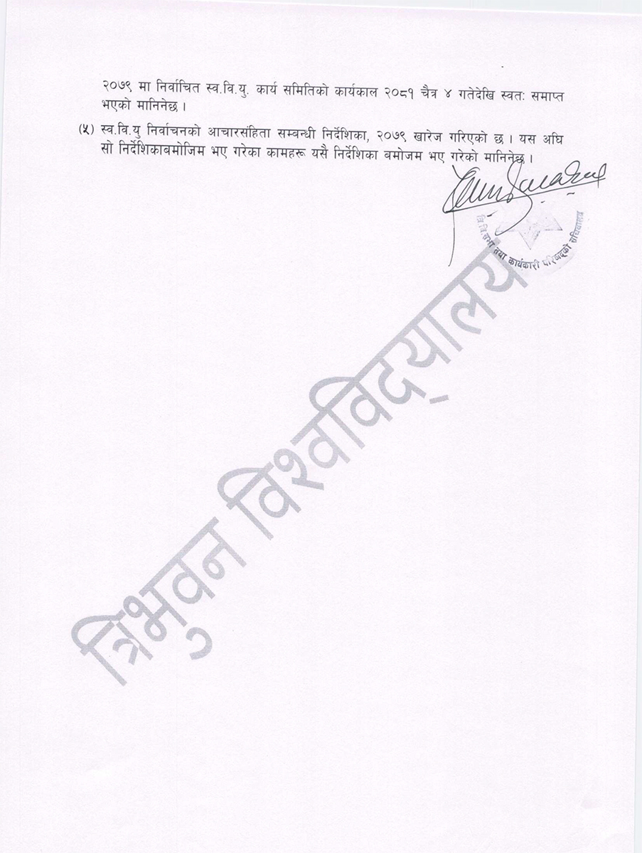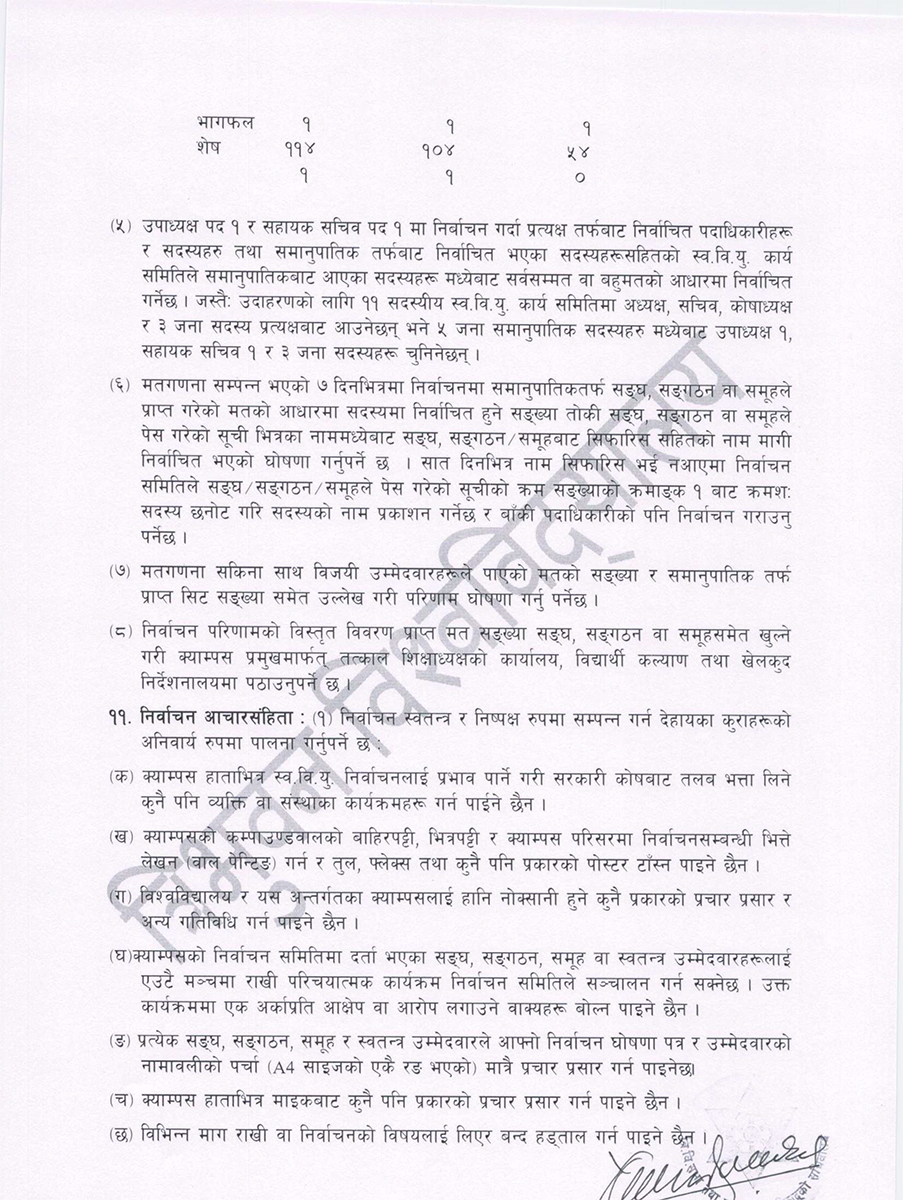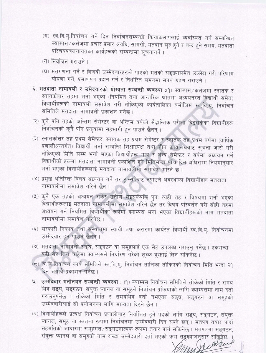 स्नातकोत्तर तह प्रथम सेमेष्टर, स्नातक तह प्रथम सेमेष्टर र स्नातक तह प्रथम वर्षमा विद्यार्थी भर्ना सम्बन्धी शिक्षाध्यक्ष तथा डीन कायर्यालयबाट सूचना जारी गरी तोकिएको मितिसम्म भर्ना भएका विद्यार्थीहरू मात्र र अन्य सेमेष्टर र वर्षमा अध्ययन गर्ने विद्यार्थीको हकमा मतदाता नामावली प्रकाशित हुने मितिभन्दा ५ दिनअघिसम्म नियमानुसार भर्ना भएका विद्यार्थीहरूलाई मतदाता नामावलीमा समावेश गरिने जनाइएको छ ।