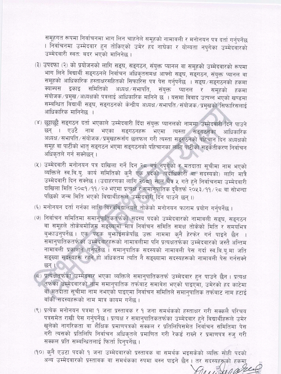 उम्मेदवारी मनोनयन पत्र दाखिला गर्ने दिन २८ वर्ष नपुगेको र मतदाता सूचीमा नाम भएको व्यक्तिले स्ववियु कार्यसमितिको कुनै एक पदको पदाधिकारी वा सदस्यको लागि मात्रै उम्मेदवारी दिन सक्ने व्यवस्था गरेको छ ।