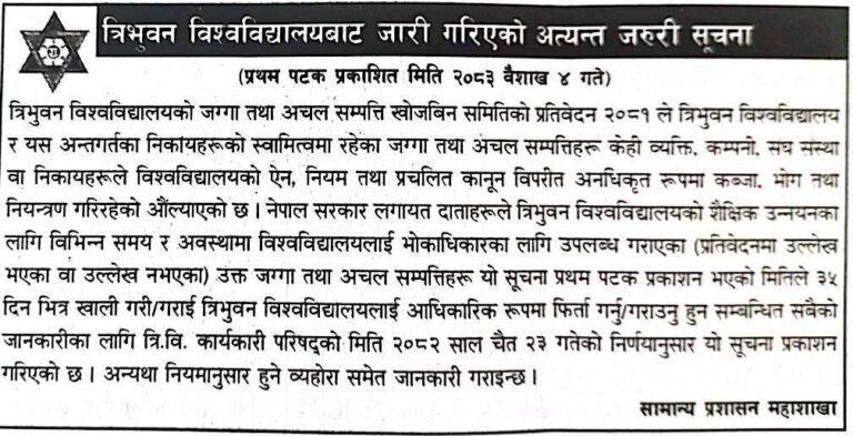 विश्वविद्यालयले शुक्रबार एक सूचना जारी गर्दै ३५ दिनभित्र त्यस्ता सम्पत्ति खाली गर्न चेतावनी दिएको हो। विश्वविद्यालयद्वारा गठित जग्गा तथा अचल सम्पत्ति खोजबिन समितिको प्रतिवेदन २०८१’ ले त्रिविका धेरै जग्गाहरू प्रचलित ऐन, नियम र कानुन विपरीत अनधिकृत रूपमा कब्जा र नियन्त्रणमा रहेको तथ्य फेला पारेको थियो। सोही प्रतिवेदनको निष्कर्षलाई कार्यान्वयन गर्दै त्रिवि कार्यकारी परिषद्ले जग्गा फिर्ता गराउने निर्णय गरेको हो।