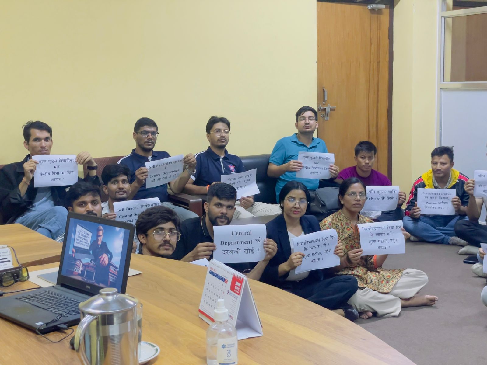बिहीबारदेखि विश्वविद्यालयको उपकुलपति कार्यालयभित्र धर्ना सुरु गरिएको छ । आन्दोलनमा सहभागी विद्यार्थीहरूले शिक्षामा शोषण बन्द गर, शुल्क तुरुन्त घटाउ गरीब विद्यार्थीको छातीमा गोली, यो त केन्द्रीय विभागको नीतिमा झोली, भन्ने नारासहित प्रदर्शन गरेका छन् ।