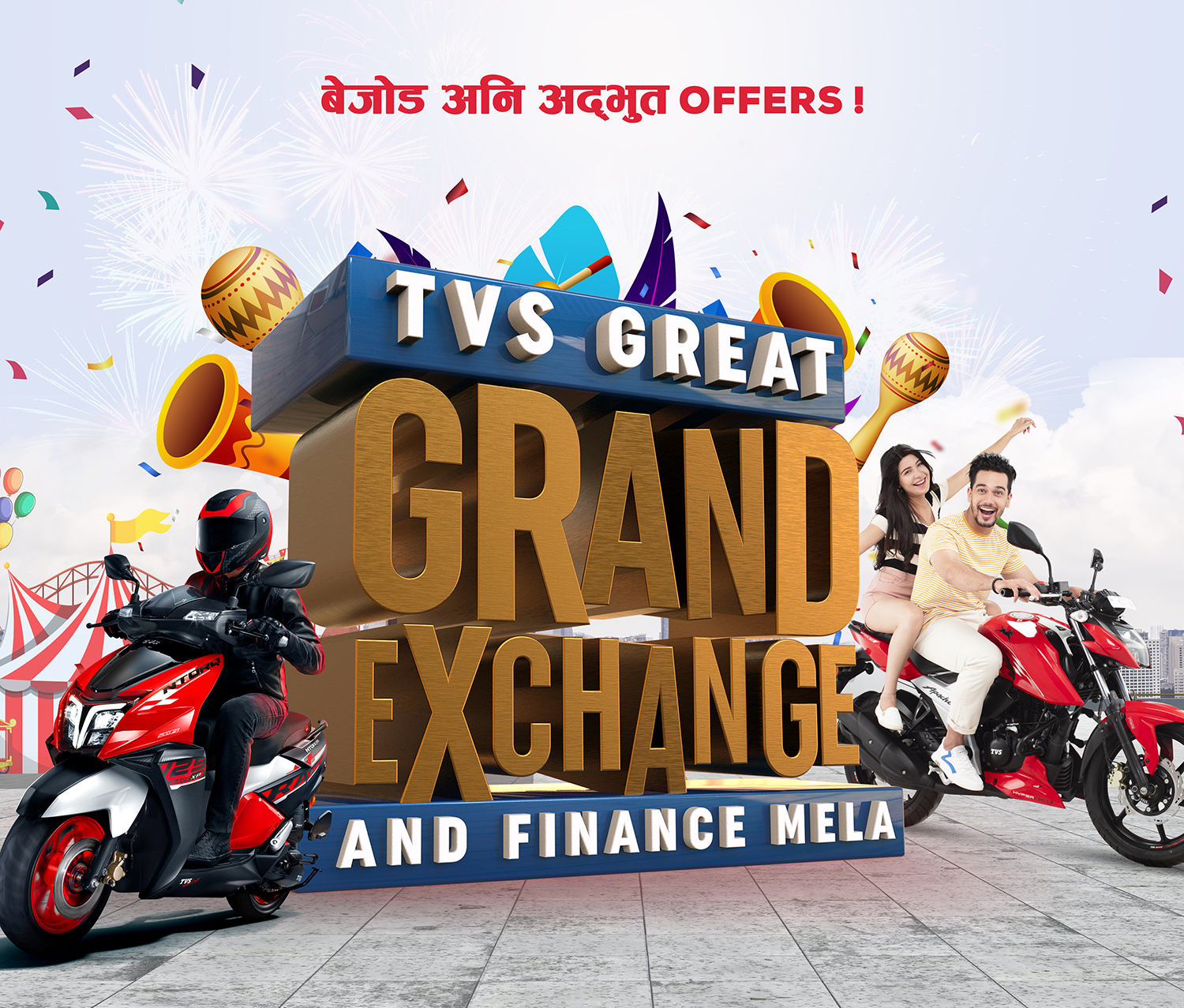 काठमाण्डु – नेपालका लागि टिभिएसको आधिकारिक वितरक कम्पनी जगदम्बा मोटर्सले टीभिएस ग्रेट ग्राण्ड एक्सचेन्ज एण्ड फाइनान्स मेला नामका बेजोड अनि अद्भुत एक्सचेन्ज मेलाको आयोजना गर्ने भएकाे छ ।