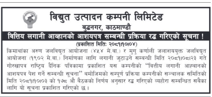 मंसिर २३ गते वित्तीय लगानी आह्वान गरिएका २ जलविद्युत् आयोजनाको आशयपत्रसम्बन्धी प्रक्रिया विद्युत् उत्पादन कम्पनी लिमिटेडले रद्द गरेको हो ।