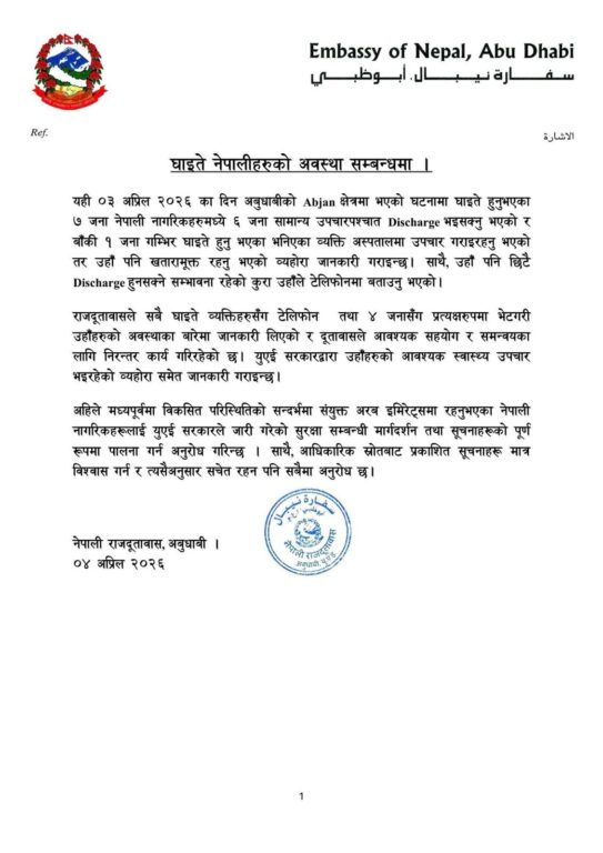 अबुधाबीस्थित नेपाली राजदूतावासले शनिबार विज्ञप्ति जारी गर्दै घाइतेमध्ये १ जनाको अवस्था गम्भीर भनिए तापनि उनी अहिले खतरामुक्त रहेको र अस्पतालमा उपचार गराइरहेका जानकारी दिएको छ ।