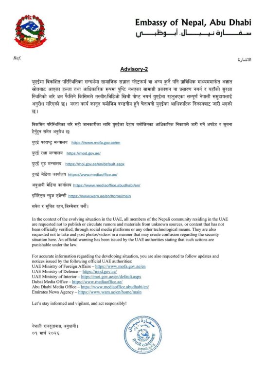 आबुधाबीमा रहेको नेपाली दूतावासले अहिले यूएईमा विकसित परिस्थितिको सन्दर्भमा सूचनामार्फत सामाजिक सञ्जाल प्लेटफर्म वा अन्य कुनै माध्यमबाट हल्ला तथा आधिकारिक रूपमा पुष्टि नभएका सामग्री प्रकाशन वा प्रसारण नगर्न र सुरक्षा स्थितिबारे भ्रम फैलिने मनसायको सन्देश प्रवाह नगर्न सचेत गराएको छ ।