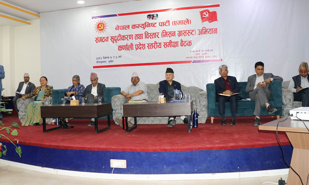 सुर्खेत । कर्णाली प्रदेशको राजधानी सुर्खेतको वीरेन्द्रनगरमा नेकपा एमालेको संगठन सुदृढीकरण तथा विस्तार (मिसन ग्रासरूट) अभियानको कर्णाली प्रदेशस्तरीय समीक्षा बैठक आजदेखि सुरू भएको छ ।