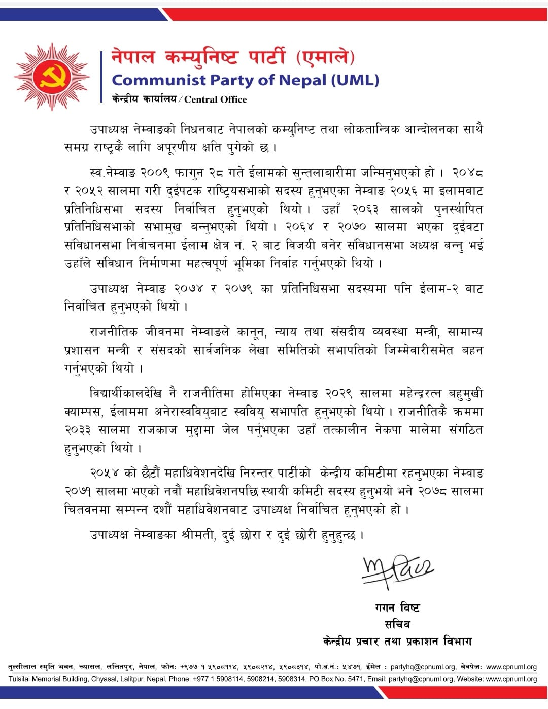 एमाले केन्द्रीय प्रचार तथा प्रकाशन विभाग सचिव गगन विष्टद्वारा जारी विज्ञप्तिमा नेम्वाङको राजनीतिक जीवन र योगदानको स्मरण गरिएको छ ।