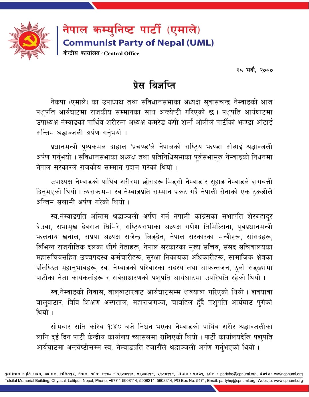 आज बिहीबार दिउँसो नेम्वाङको अन्त्येष्टिपछि प्रेस विज्ञप्ति जारी गर्दै एमालेले उपाध्यक्ष नेम्वाङको निधनबाट नेपालको कम्युनिष्ट तथा लोकतान्त्रिक आन्दोलनका साथै समग्र राष्ट्रकै लागि अपुरणीय क्षति पुगेको जनाएको छ ।
