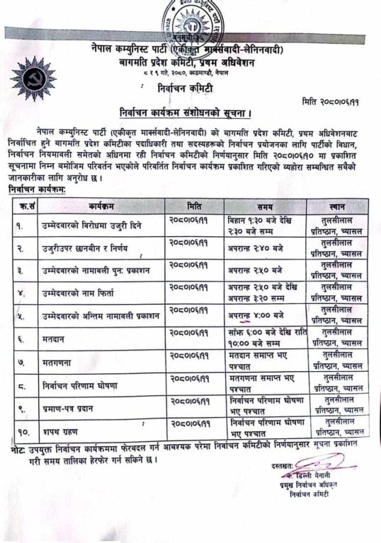 काठमाण्डु – नेकपा एमाले बागमती प्रदेश अधिवेशनको निर्वाचन कार्यक्रम संशोधन गरेर साँझ ६ बजेदेखि मतदान हुने भएको छ ।
