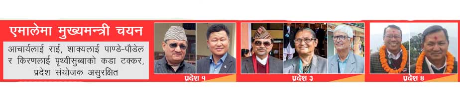 प्रदेश–३ मा पनि संयोजक रहेकी उपाध्यक्ष अष्टलक्ष्मी शाक्यलाई पोलिटब्युरो सदस्य राजेन्द्र पाण्डे र डोरमणि पौडेलले कडा टक्कर दिएका छन् । प्रदेश–३ मा अन्य नेता पनि आकांक्षी छन् । प्रदेश–४ की प्रमुख स्थायी कमिटी सदस्य किरण गुरुङलाई सचिवसमेत रहेका लोकप्रिय नेता पृथ्वीसुब्बा गुरुङले कडा टक्कर दिएका छन् । प्रदेश–१ र ३ मा आज शुक्रबार संसदीय दलको नेता चयनका लागि निर्वाचन तोकिएको छ भने प्रदेश–४ को चुनाव २८ माघमा तय गरिएको छ ।