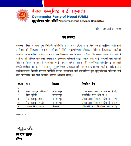 पार्टीले टिकट दिएका आधिकारिक उम्मेदवारविरुद्ध बागी उम्मेदवारी दिएका सुदूरपश्चिम प्रदेश कमिटि सदस्यद्धय टेकबहादुर हमाल र खेम सुवेदीसहितका पाँच नेतालाई साधारण सदस्य समेत नहरनेगरी निष्कासन गरिएको हो ।