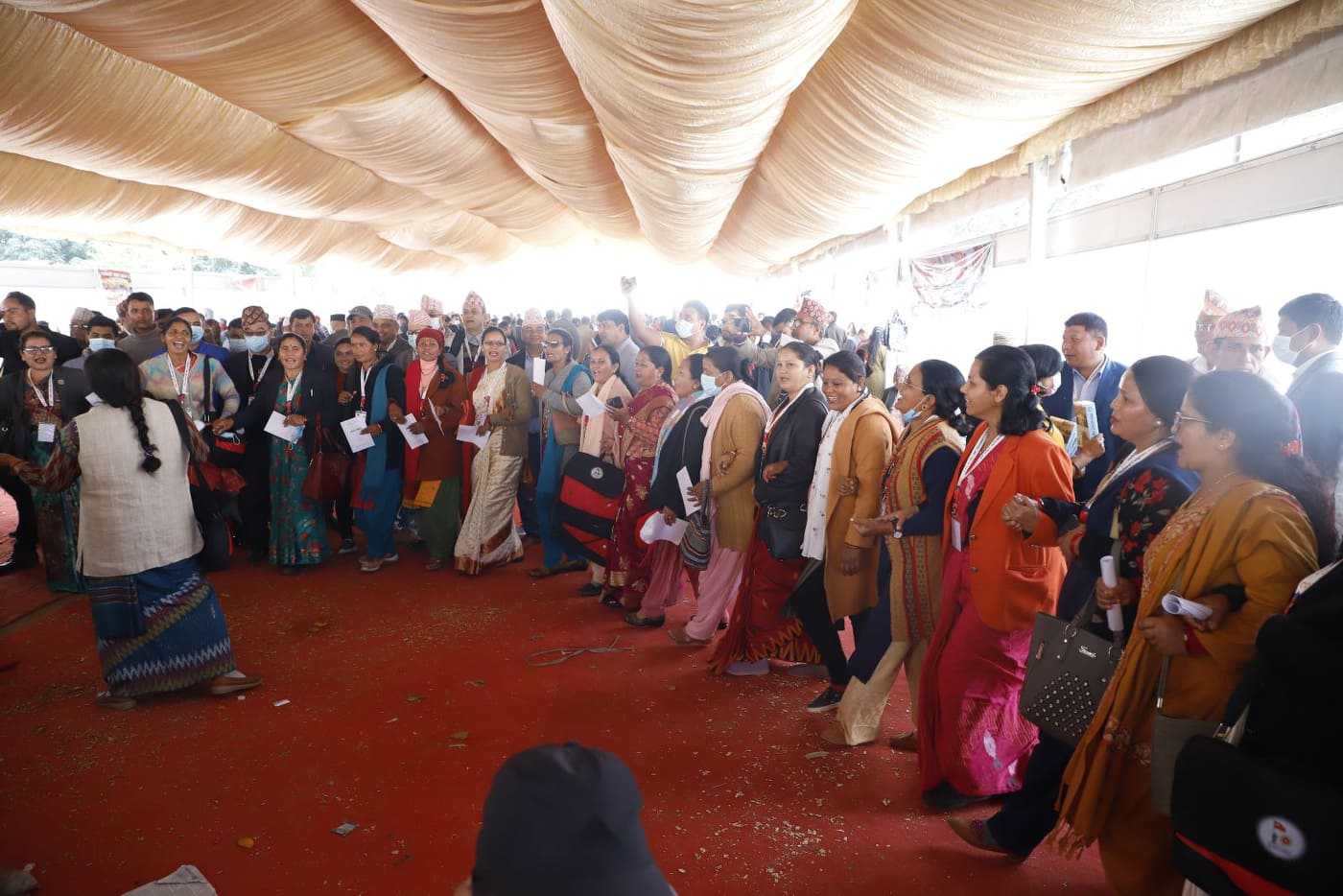 सुदूरपश्चिम प्रदेशबाट आएका महाधिवेशन प्रतिनिधिहरू देउडा गाउँदै रमाइलो नृत्य गरिरहेका छन् ।