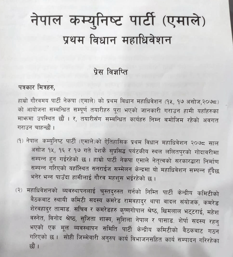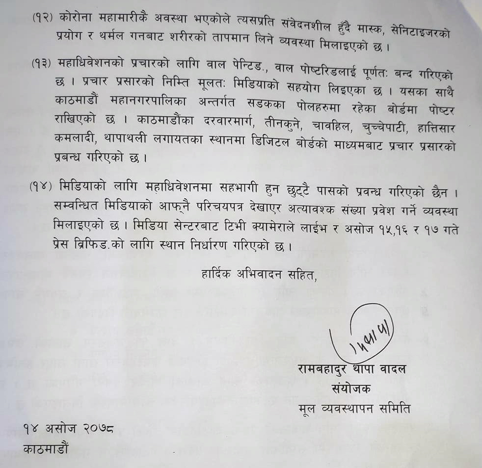 बिहीबार महाधिवेशनबारे जानकारी दिन आयोजित पत्रकार सम्मेलनमा सम्पूर्ण तयारी पूरा भएको जानकारी दिइयो । मूल व्यवस्थापन समिति संयोजक रामबहादुर थापा ‘बादल’द्वारा जारी विज्ञप्तिमा महाधिवेशनका लागि ७ हजार क्षमताको हल व्यवस्थापन गरिएको छ ।