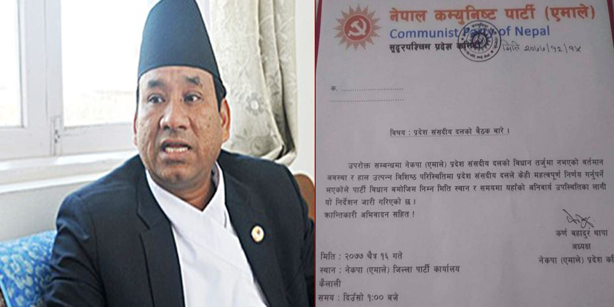 दलको विधान तर्जुमा नभएको वर्तमान अवस्था र हाल उत्पन्न विशिष्ठ परिस्थितिमा केही महत्वपूर्ण वैठक गर्नु पर्ने भएको भन्दै थापाले सांसदहरुलाई पत्र लेखेरै सोमबार (आज) दिउँसो १ बजे बैठकमा आउन आग्रह गरेका थिए ।