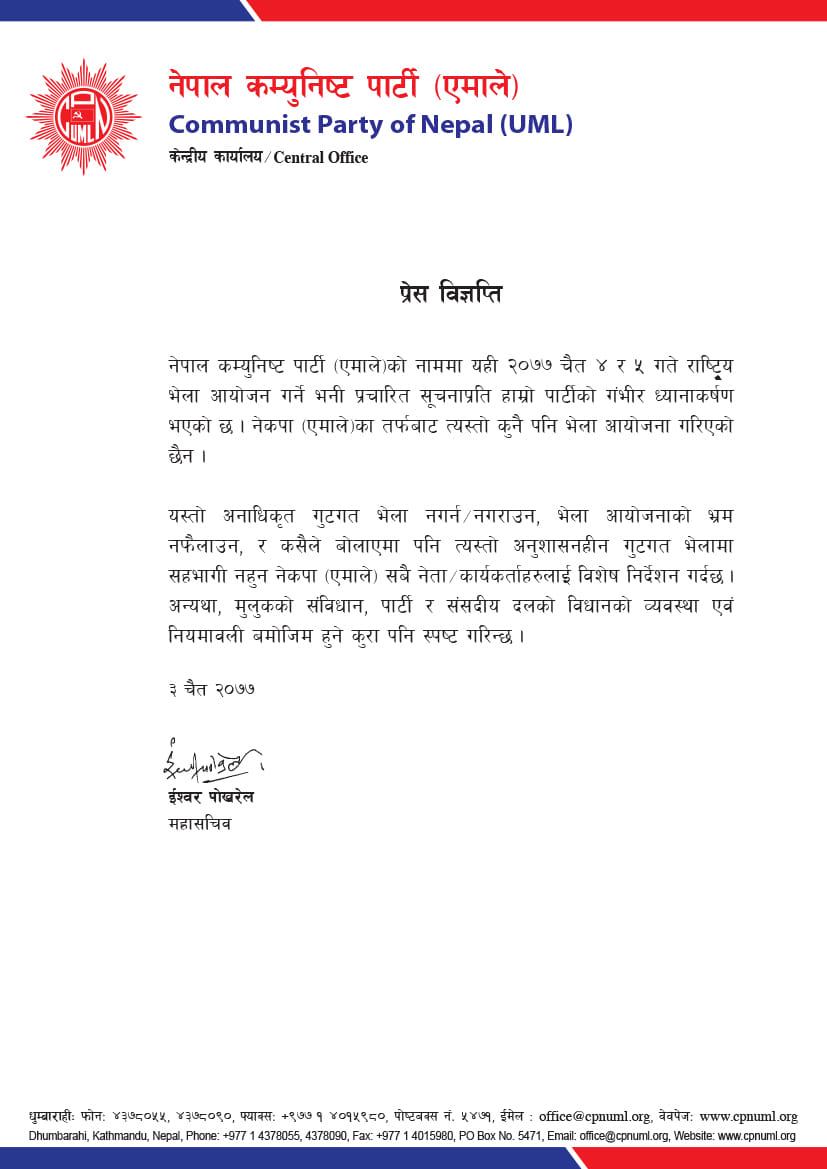 महासचिव ईश्वर पोखरेलले मंगलबार एक विज्ञप्ति जारी गर्दै चैत ४ र ५ गते एमालेले राष्ट्रिय भेला आयोजना नगरेको स्पष्ट पार्दै उक्त भेलामा सहभागी नहुन निर्देशन दिएका हुन् ।