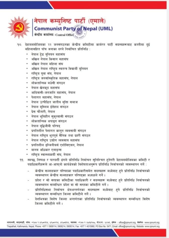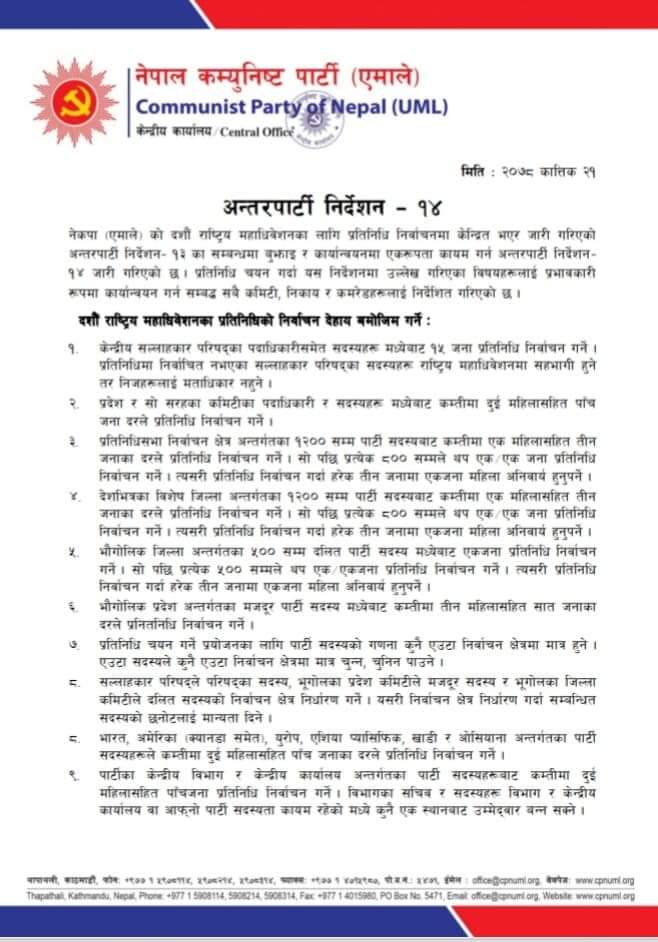 २०७७ चैत मसान्तसम्मका पार्टी सदस्य मात्रै राष्ट्रिय महाधिवेशन प्रतिनिधि निर्वाचनका लागि मतदाता हुने अपानिमा उल्लेख गरिएको छ । साथै प्रतिनिधिहरुको निर्वाचन केन्द्रीय संगठन विभागबाट अभिलिखित पार्टी सदस्यताको विवरणको आधारमा गरिने छ । २०७८ कात्तिक २७ गते स्वदेश तथा प्रवासमा एकैसाथ प्रतिनिधि निर्वाचन गरिने छ ।