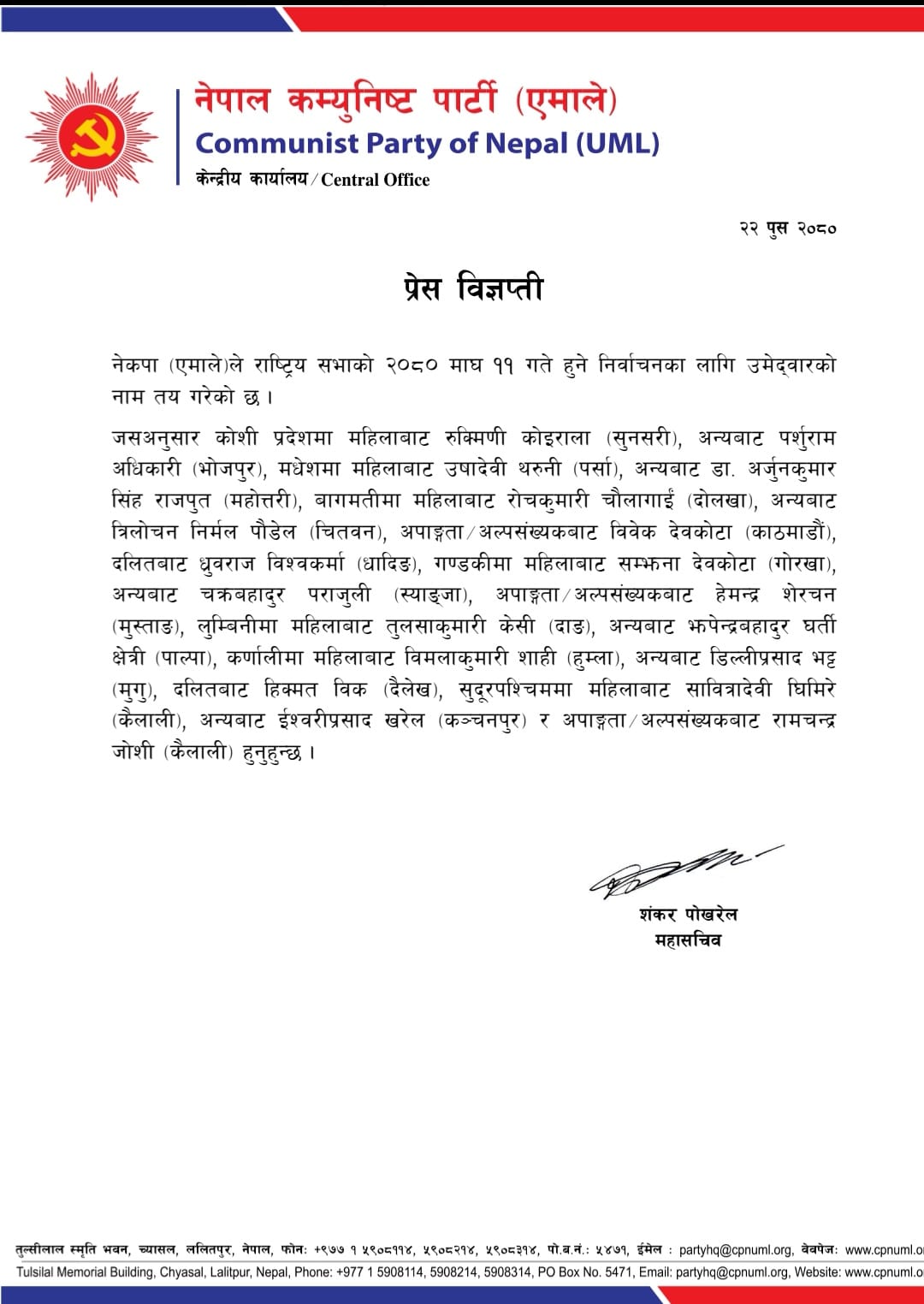 एमालेले टुंग्यायो राष्ट्रियसभा सदस्यको उमेदवार (सूचीसहित)