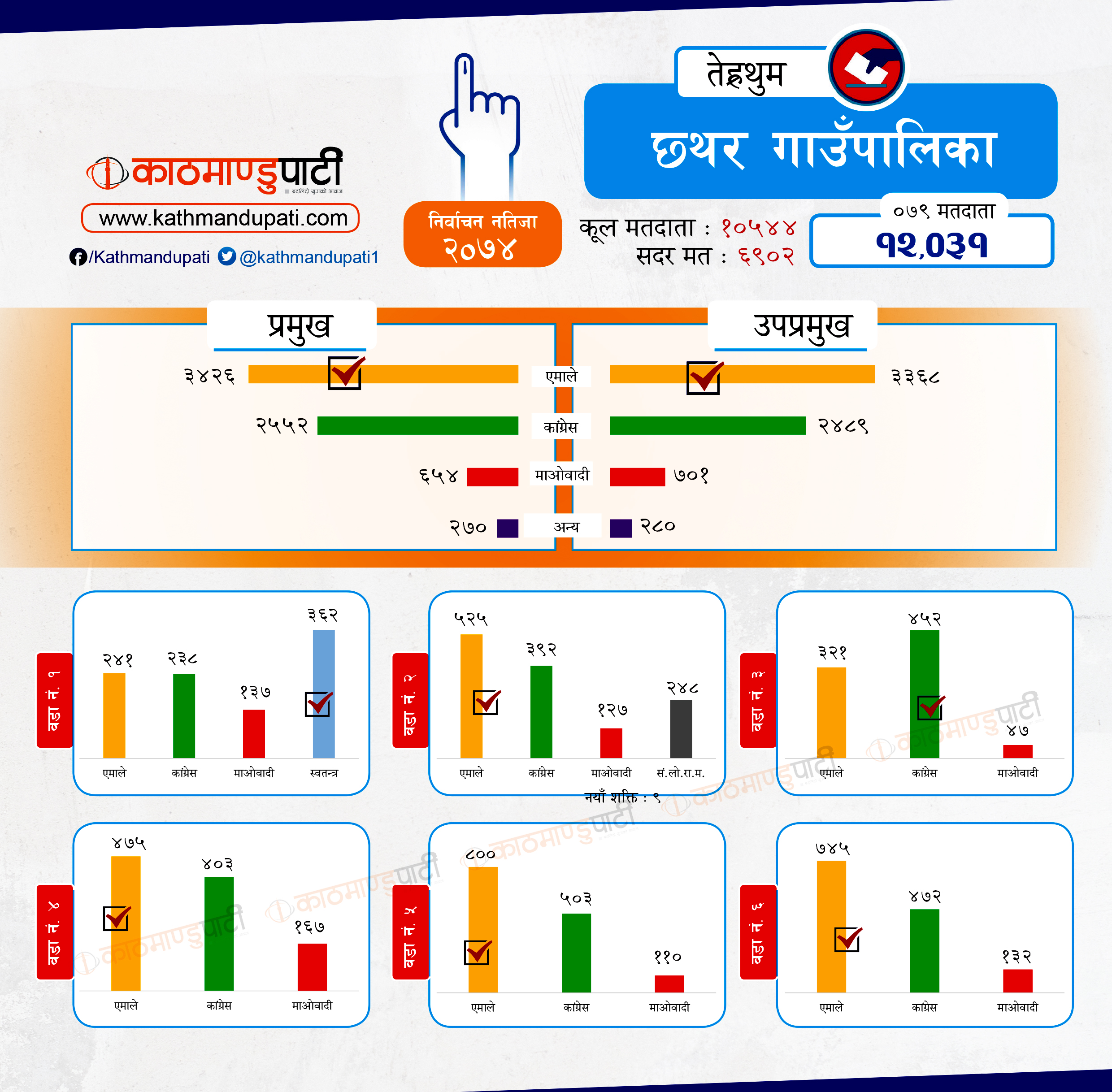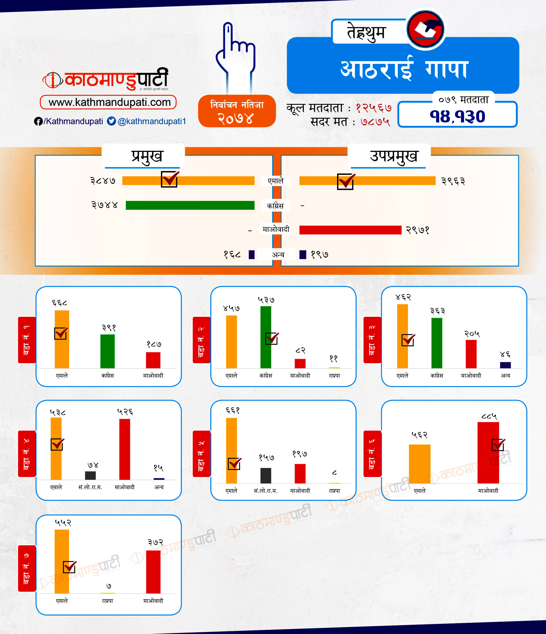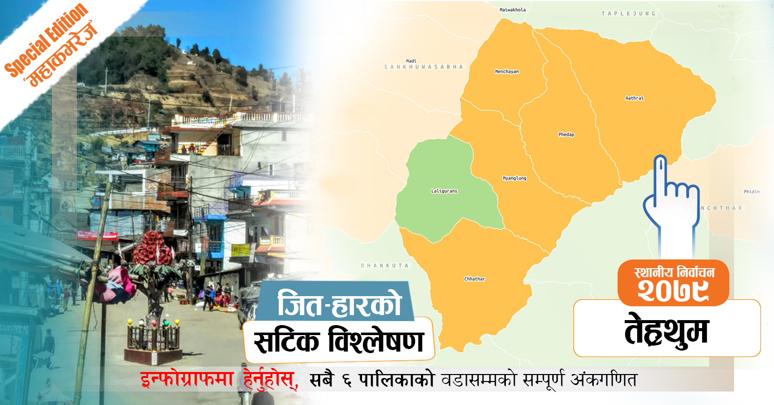 यस्तै, उसले मेन्छ्यायेम गाउँपालिकाको अध्यक्ष पनि जित्यो । कांग्रेसले लालीगुँरास नगरपालिकाको मेयर–उपमेयर र मेन्छ्यायेम गाउँपालिकाको उपाध्यक्ष जितेको थियो । तेह्रथुमका दुई गाउँपालिका आठराई र फेदापमा गत चुनावमा पनि कांग्रेस र माओवादी मिलेका थिए । तर, दुवैमा एमाले साघुँरो मतान्तरले विजयी भयो । छथरको मत हेर्दा यी दुई दलभन्दा एमालेकै बढी देखिन्छ । सदरमुकामसमेत रहेको म्याङलुङ नगरमा पनि माओवादी कमजोर छ । मिल्दा पनि एमालेकै मत बढी देखिन्छ ।