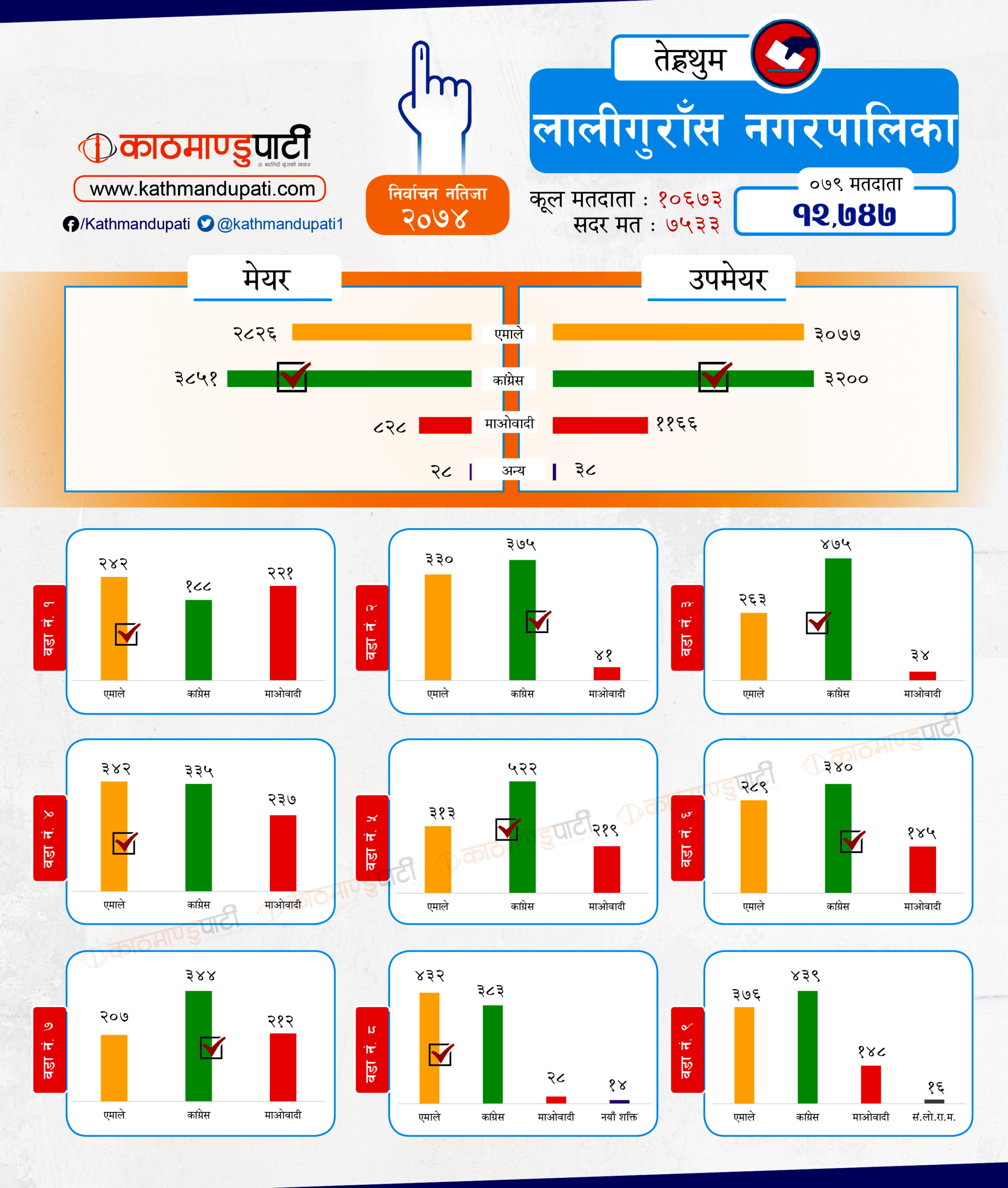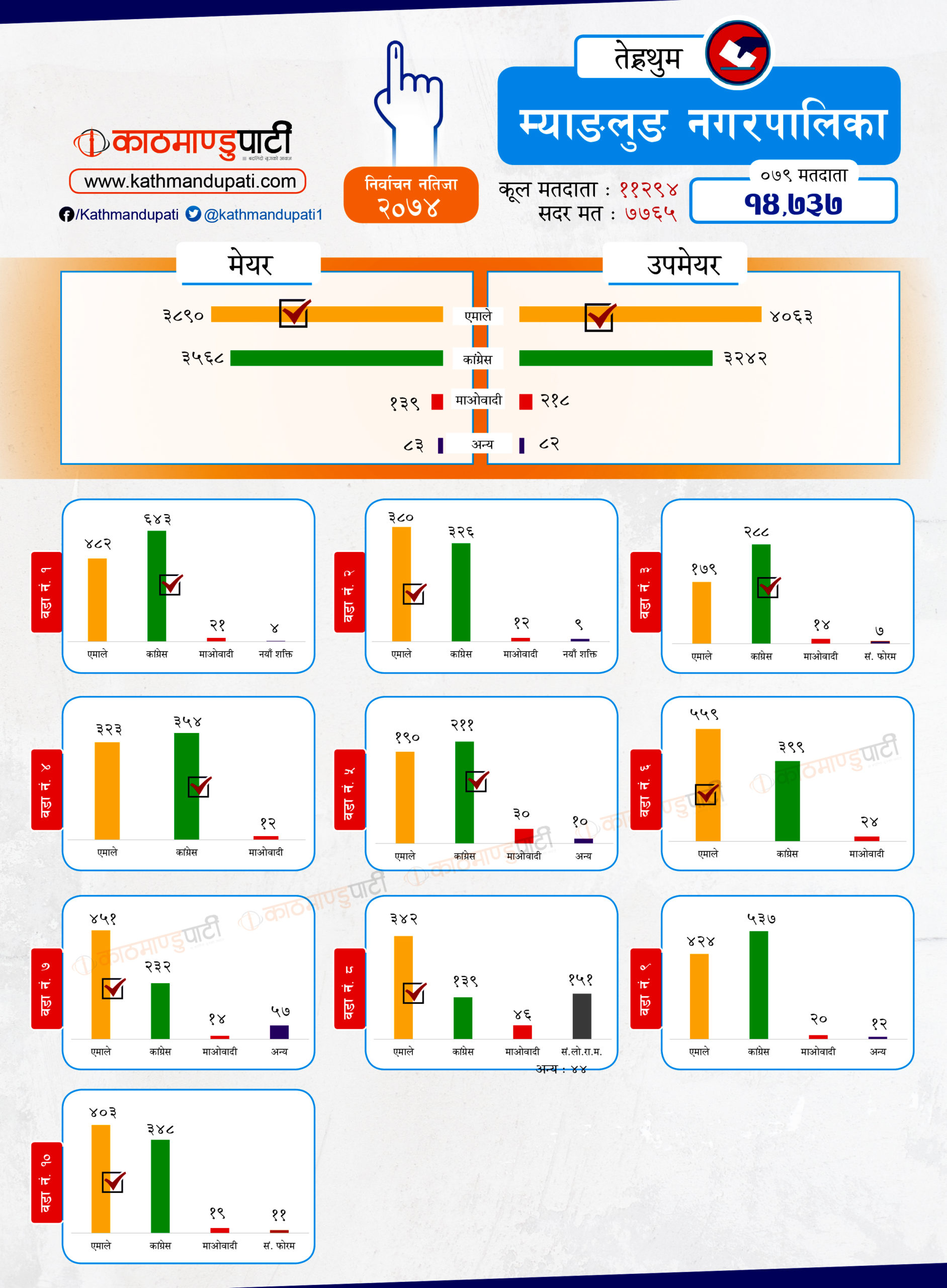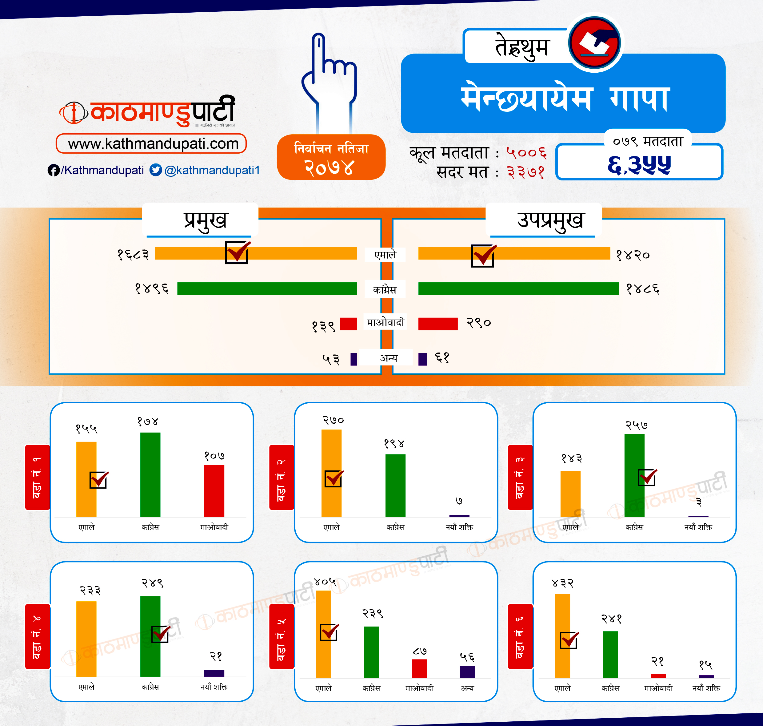 यस्तै, उसले मेन्छ्यायेम गाउँपालिकाको अध्यक्ष पनि जित्यो । कांग्रेसले लालीगुँरास नगरपालिकाको मेयर–उपमेयर र मेन्छ्यायेम गाउँपालिकाको उपाध्यक्ष जितेको थियो । तेह्रथुमका दुई गाउँपालिका आठराई र फेदापमा गत चुनावमा पनि कांग्रेस र माओवादी मिलेका थिए । तर, दुवैमा एमाले साघुँरो मतान्तरले विजयी भयो । छथरको मत हेर्दा यी दुई दलभन्दा एमालेकै बढी देखिन्छ । सदरमुकामसमेत रहेको म्याङलुङ नगरमा पनि माओवादी कमजोर छ । मिल्दा पनि एमालेकै मत बढी देखिन्छ ।