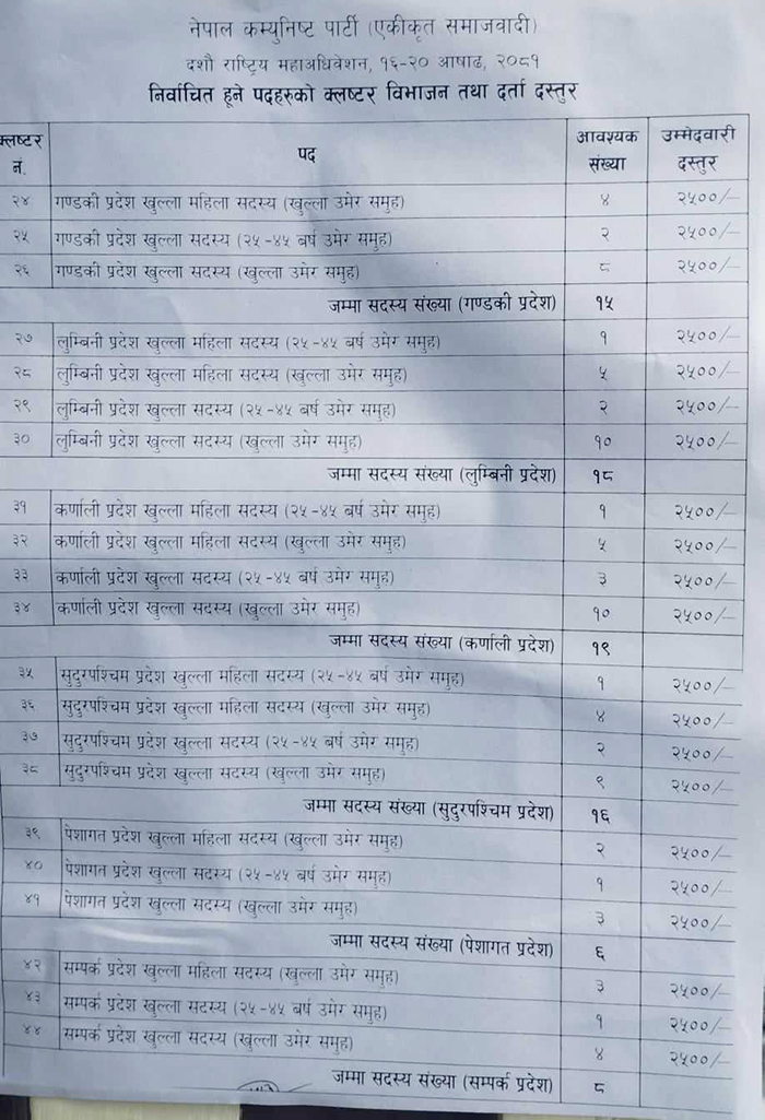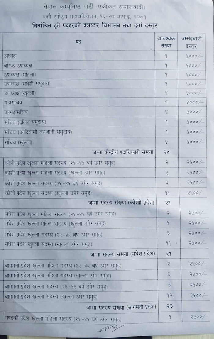साथै समितिले विभिन्न पदका निम्ति उमेदवारी शुल्कको सूची पनि सार्वजनिक गरेको छ । अध्यक्षदेखि सचिवसम्म प्रति उम्मेदवार शुल्क पाँच हजार रुपैयाँ तोकिएको छ । बाँकीका लागि दुई हजार ५०० रुपैयाँ शुल्क तोकिएको छ ।