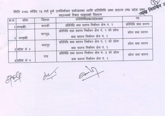 दाङ–३ ‘ख’ बाट प्रदेश ५ का प्रदेशसभा सदस्य उत्तमकुमार ओलीको सवारी दुर्घटठनामा निधन भएपछि उक्त स्थानको पद खाली छ । त्यस्तै भक्तपुर–१ ‘ख’बाट निर्वा्िचत प्रदेशसभा सदस्य हरिशरण लामिछाने र बागलुङ–२ ‘ख’बाट निर्वा्िचत राष्ट्रिय जनमोर्चाका सांसद टेक बहादुर घर्तीको निधन भएपछि यो क्षेत्रमा पनि खाली छ ।