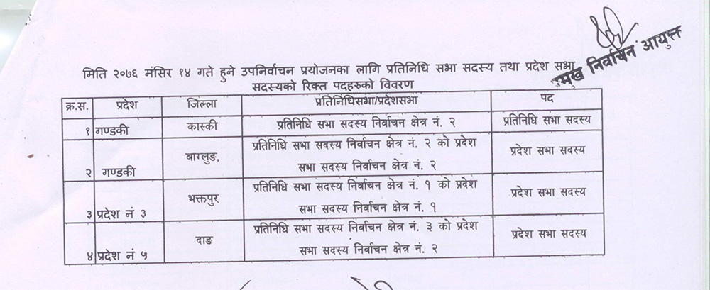 आयोगले मङ्सिर १४ गते शनिबार ३७ जिल्लामा एक उपमहानगर प्रमुख, ३ गाउँपालिका अध्यक्ष, एक गगाउँपालिका उपाध्यक्ष, ४१ वडा अध्यक्ष, ३ प्रदेश सभा सदस्य र एक प्रतिनिधि सभा सदस्य गरि कुल ५० पदमा उप निर्वाचन हुने जानकारी दिएको छ ।