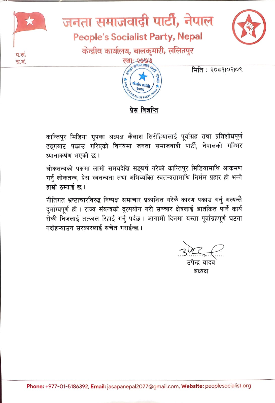 काठमाण्डु- जनता समाज पार्टी (जसपा) नेपालले कान्तिपुर मिडिया ग्रुपका अध्यक्ष कैलाश सिरोहियालाई पूर्वाग्रह ढंगबाट पक्राउ गरिएको जनाएको छ ।