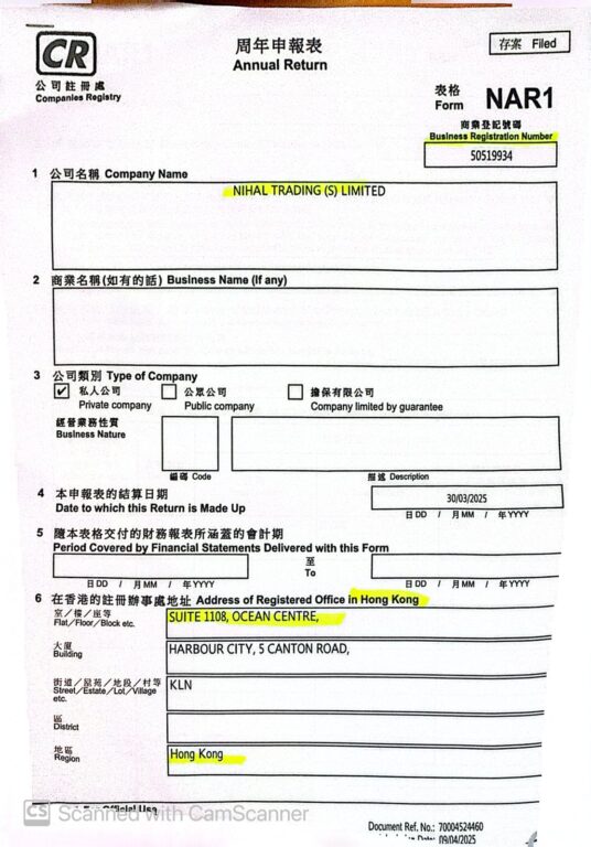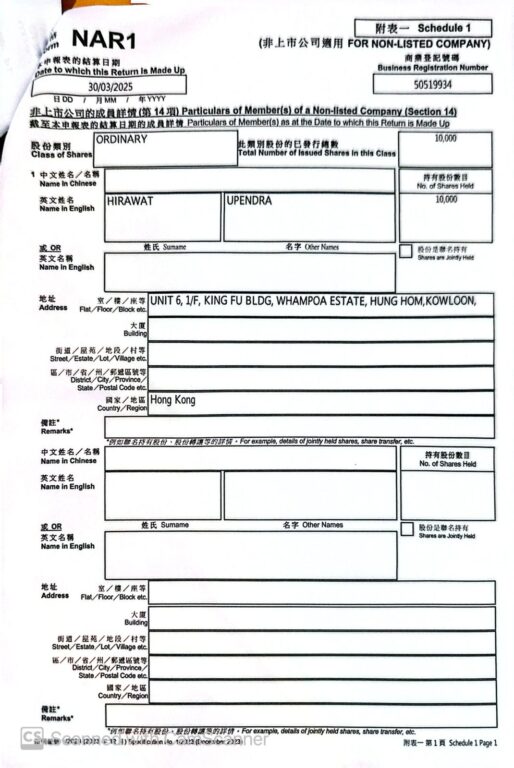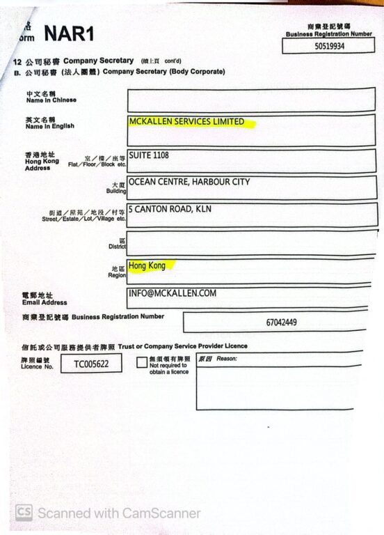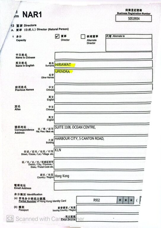 हङकङमा खोलिएका कम्पनीसँग सम्बन्धित कागजात –