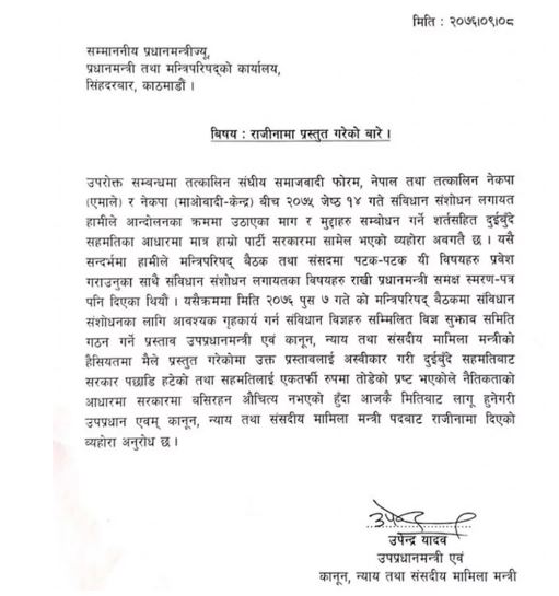 पार्टी अध्यक्षसमेत रहेका यादवले प्रधानमन्त्रीलाई सम्बोधन गर्दै प्रधानमन्त्री तथा मन्त्रीपरिषद कार्यालयमा बुझाएकाे राजीनामा पत्रमा संविधान संशोधन प्रस्ताव अस्वीकार गरेर सरकार दुईबुँदे सहमतिबाट पछि हटेको उल्लेख गरेका छन् ।