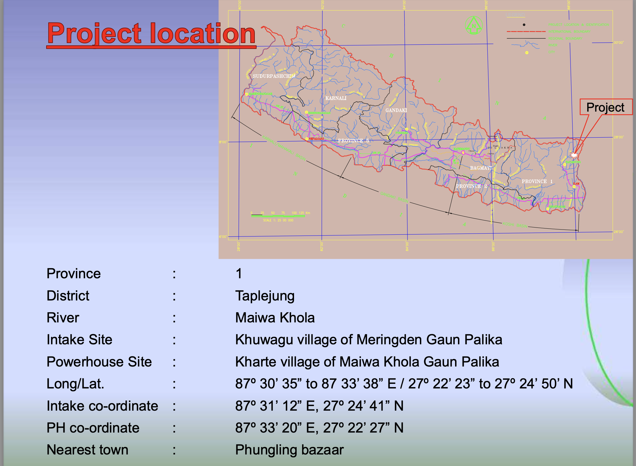 काठमाण्डु- ताप्लेजुङमा बन्न लागेको अपर मेवा खोला जलविद्युत परियोजनाको काम अघि बढेको छ । कांग जलविद्युत कम्पनी लिमिटेडले बनाउन लागेको १७.८५ मेगावाटको कार्यालयको बुधवार कोटेश्वरमा नेपाली सेनाका पूर्वरथी फत्तेबहादुर लिम्बुले उदघाटन गरे ।
