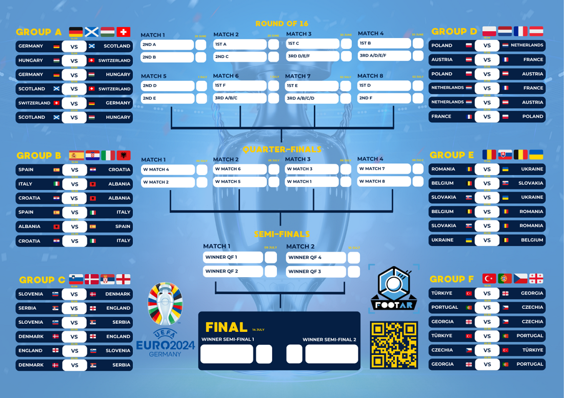 यस्तै समूह ‘बी’ मा स्पेन, क्रोएसिया, इटाली र अल्बानिया रहेका छन् भने समूह ‘सी’ मा स्लोभानिया, डेनमार्क, सर्विया र इङ्ल्याण्ड छन् । समूह ‘डी’मा नेदरल्याण्ड, अष्ट्रिया, फ्रान्स र समूह प्लेअफ विजेता एलाई राखिएको छ भने समूह ‘ई’ मा बेल्जियम, स्लोभाकिया, रोमानिया र प्लेअफ विजेता बीलाई राखिएको छ । समूह ‘एफ’मा टर्की, प्ले अफ विजेता सी, पोर्चुगल र चेज रिपब्लिक छन् ।