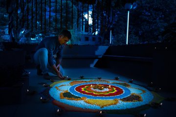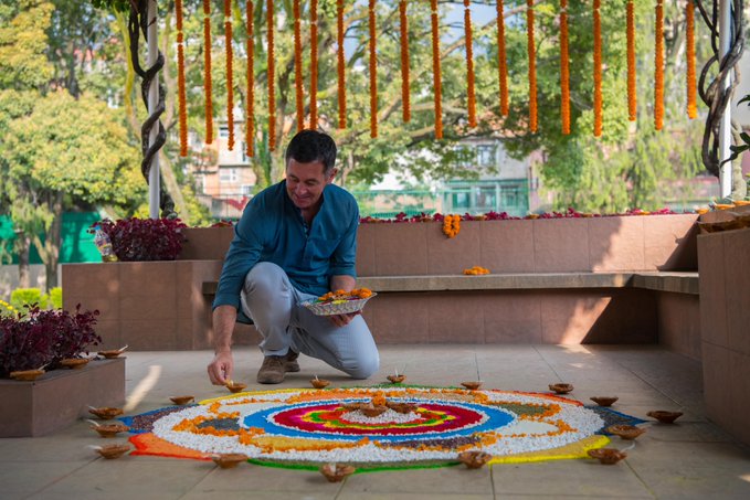 उनले आइतवार लक्ष्मीपूजाका दिन आफ्नो निवासमा मण्डला बनाउँदै गरेको तस्बिर सार्वजनिक गरेका छन् । उनले दीप र फूलहरुको पर्व तिहार मनाउन उत्साहका साथ लागेका छन् ।
