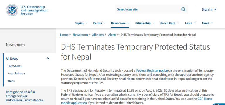 नेपालीको लागि टीपीएस हैसियत सूचना प्रकाशित भएको ६० दिनपछि अर्थात् २०२५ मा अगस्ट ५ राति ११ : ५९ बजे समाप्त हुने छ ।