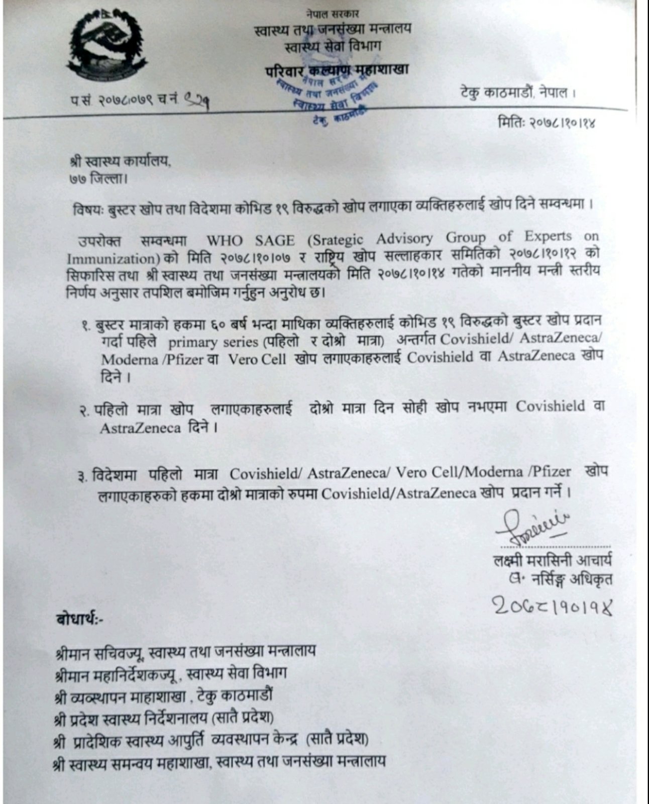 बुस्टर मात्राको हकमा ६० वर्षभन्दा माथिका व्यक्तिलाई कोभिड–१९ विरुद्धको बुस्टर खोप प्रदान गर्दा पहिलो र दोस्रो मात्रा कोभिसिल्ड, एस्ट्राजेनिका, मोडर्ना, फाइजर वा भेरोसेल खोप लगाएकाहरूलाई अब कोभिसिल्ड वा एस्ट्राजेनिका दिने निर्णयभएको स्वास्थ्य मन्त्रालयले जानकारी दिएको छ ।