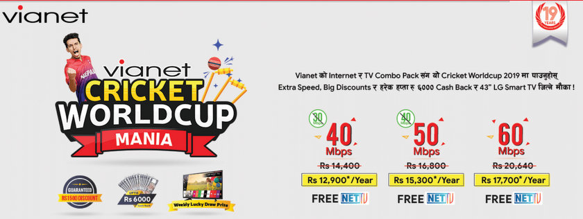 काठमाडौं – नेपालको पहिलो र बिशाल फाईबर टु दि होम (एफटीटीएच) इन्टरनेट सर्भिस प्रोभाइडर भायनेट कम्युनिकेसन्स्ले नयाँ अफर सार्वजनिक गरेको छ । भायनेटले यही जेठ १६ गतेदेखि संचालन हुने क्रिकेट वर्ल्ड कपलाई मध्यनजर गर्दै आफ्नो ग्राहकहरुको लागि “भायनेट क्रिकेट वर्ल्ड कप मेनिया” नामक नयाँ अफर ल्याएको छ ।
