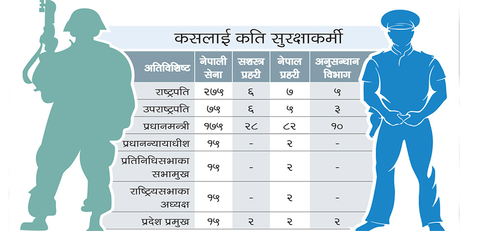 नयाँ व्यवस्थाअनुसार राष्ट्रपतिको सुरक्षार्थ सेनाका दुई सय ७५ जना, सशस्त्रका ६ जना, प्रहरीका सात जना र राष्ट्रिय अनुसन्धानका पाँच जना खटिनेछन्। त्यसैगरी, उपराष्ट्रपतिको सुरक्षार्थ सेनाका ७५, सशस्त्र ६, प्रहरीका पाँच र राष्ट्रिय अनुसन्धानका तीन जना खटिनेछन्। प्रधानमन्त्रीको सुरक्षामा एक सय ७५ जना सेना, २८ जना सशस्त्र, ८२ जना प्रहरी र १० जना राष्ट्रिय अनुसन्धानका प्रहरी खटिनेछन्।