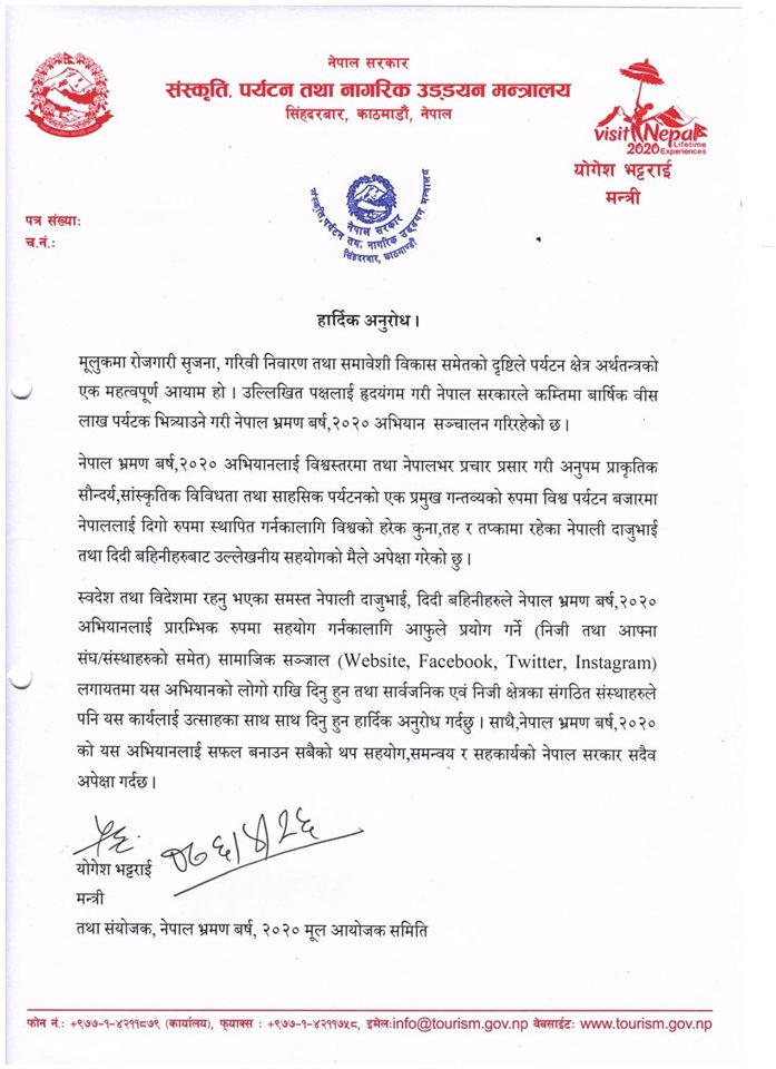 भ्रमण वर्ष अभियान सफल बनाउन सबैले आ–आफ्नो स्थानबाट सहयोग गर्न आह्वान गर्दै मन्त्री भट्टराईले आफूले प्रयोग गर्ने निजी तथा संघ–संस्थाको वेवसाइट, फेसबुक, ट्वीटर, इन्स्टाग्रामलगायत सामाजिक सञ्जालमा भ्रमण वर्षको लोगो राखेर सहयोग गर्न आग्रह गरेका हुन् ।