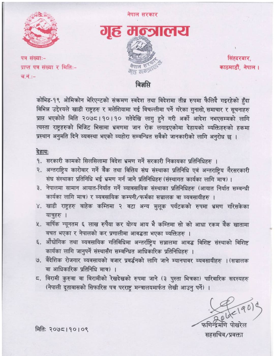 मन्त्रालयले कोभिड महामारीको कारण देखाउंदै मलेशिया र दुवईलगायत खाडी मुलुकमा भिजिट भिसामा जान सबैलाई रोक लगाएको थियो । गृहको उक्त निर्णयको चर्को विरोध भएपछि मन्त्रालयले आइर्तबार विज्ञप्ति जारी गर्दै नियम खुकुलो बनाएको हो ।