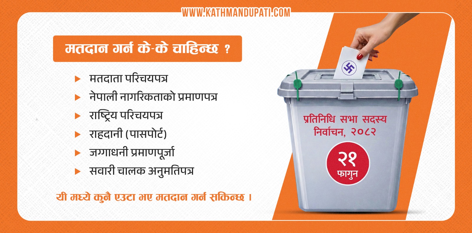 काठमाण्डु – प्रतिनिधिसभा निर्वाचनको मतदान बिहीबार हुँदैछ। निर्वाचनमा मतदाताले आफ्नो परिचयपत्र खुल्ने कागजातमार्फत सहजै मतदान गर्न पाउनेछन् ।