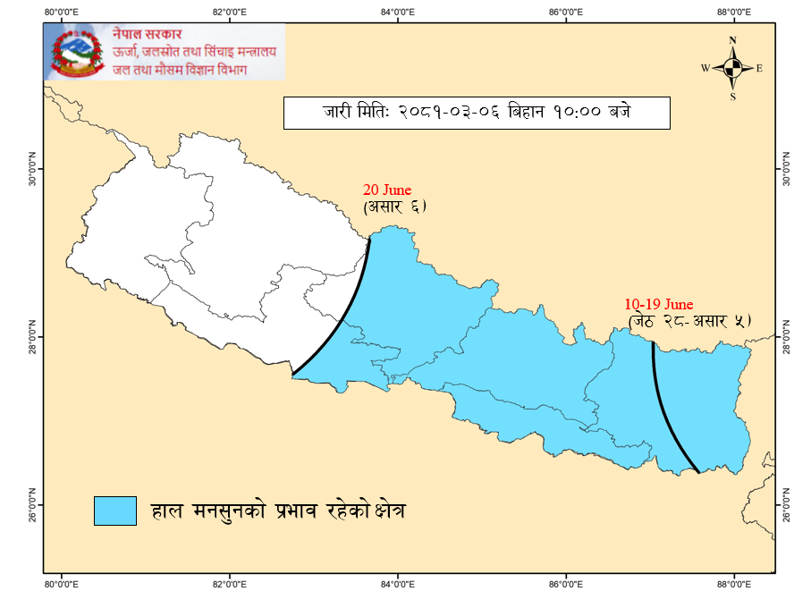 मौसम पूर्वानुमान महाशाखाका अनुसार बिहीबार कोशी प्रदेशका बाँकी भूभाग, मधेश प्रदेश, बागमती प्रदेश, गण्डकी प्रदेशका अधिकांश भूभागमा र लुम्बिनी प्रदेशका पूर्वी भूभागमा आगमन भएको छ ।