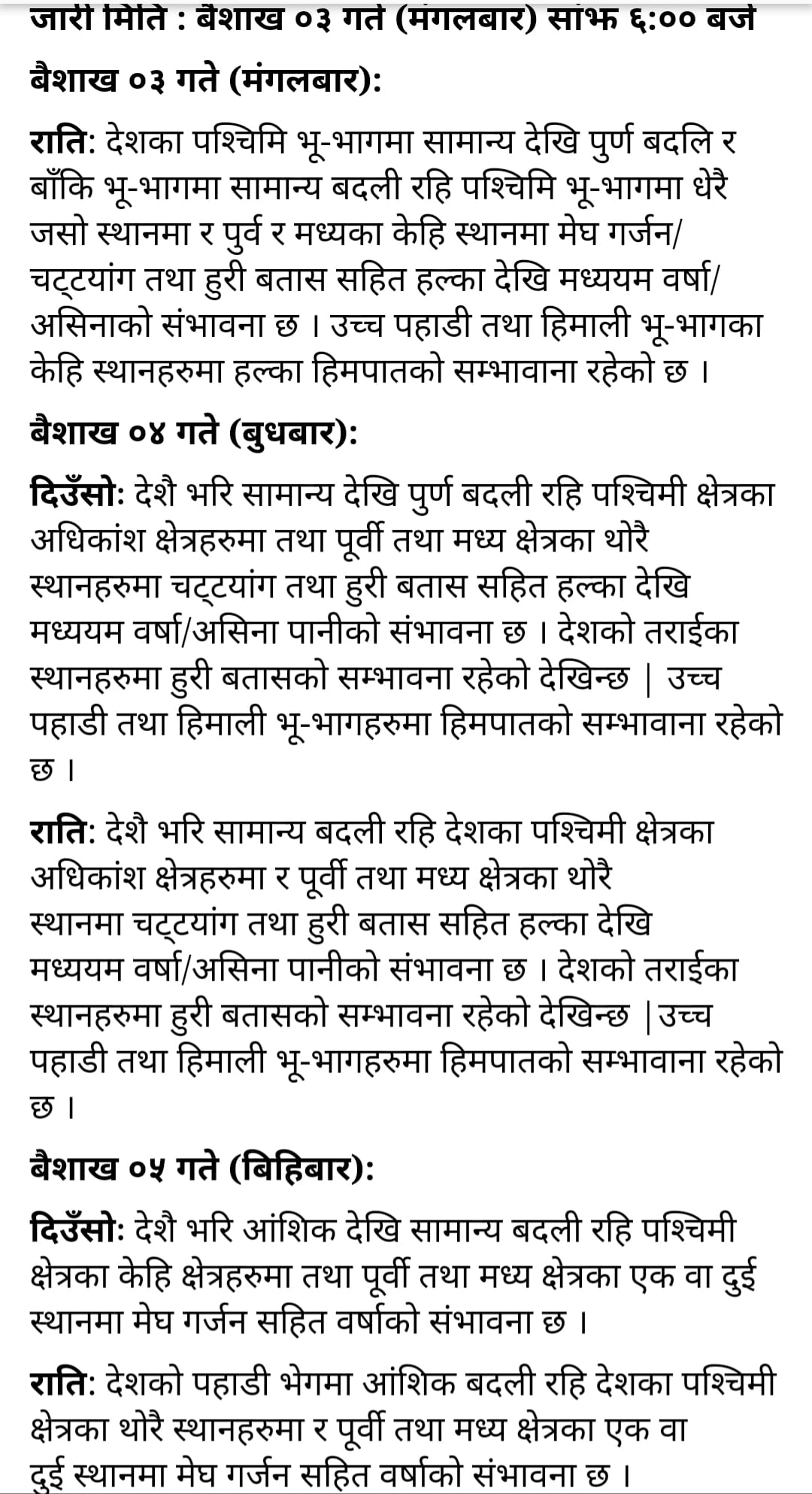 यस्तै तराईका स्थानहरुमा हुरीबतासको सम्भावना रहनुका साथै उच्च पहाडी तथा हिमाली भूभागहरुमा हिमपातको सम्भावना रहेको उल्लेख छ । विभागले सरकारले हावाहुरीबाट सतर्क रहन समेत अपिल गरेको छ।